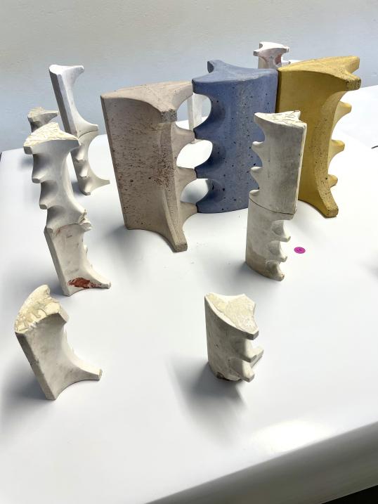 Betonwaves (after Egon Wrobel) is a sculptural series of spatial modules created using recycled concrete aggregate salvaged from the ongoing renovation of the Haus der Statistik, a monumental DDR-era building constructed between 1968 and 1970. Bound with geopolymer cement made from industrial byproducts (fly ash and blast slag) the works embody a low-carbon approach to construction, emitting up to 90% less CO₂ than traditional Portland cement.